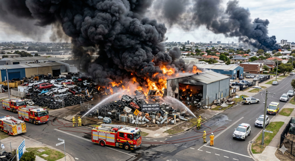GEELONG, VIC — A major industrial emergency is unfolding in Geelong’s north after a vehicle fire ignited a chain reaction